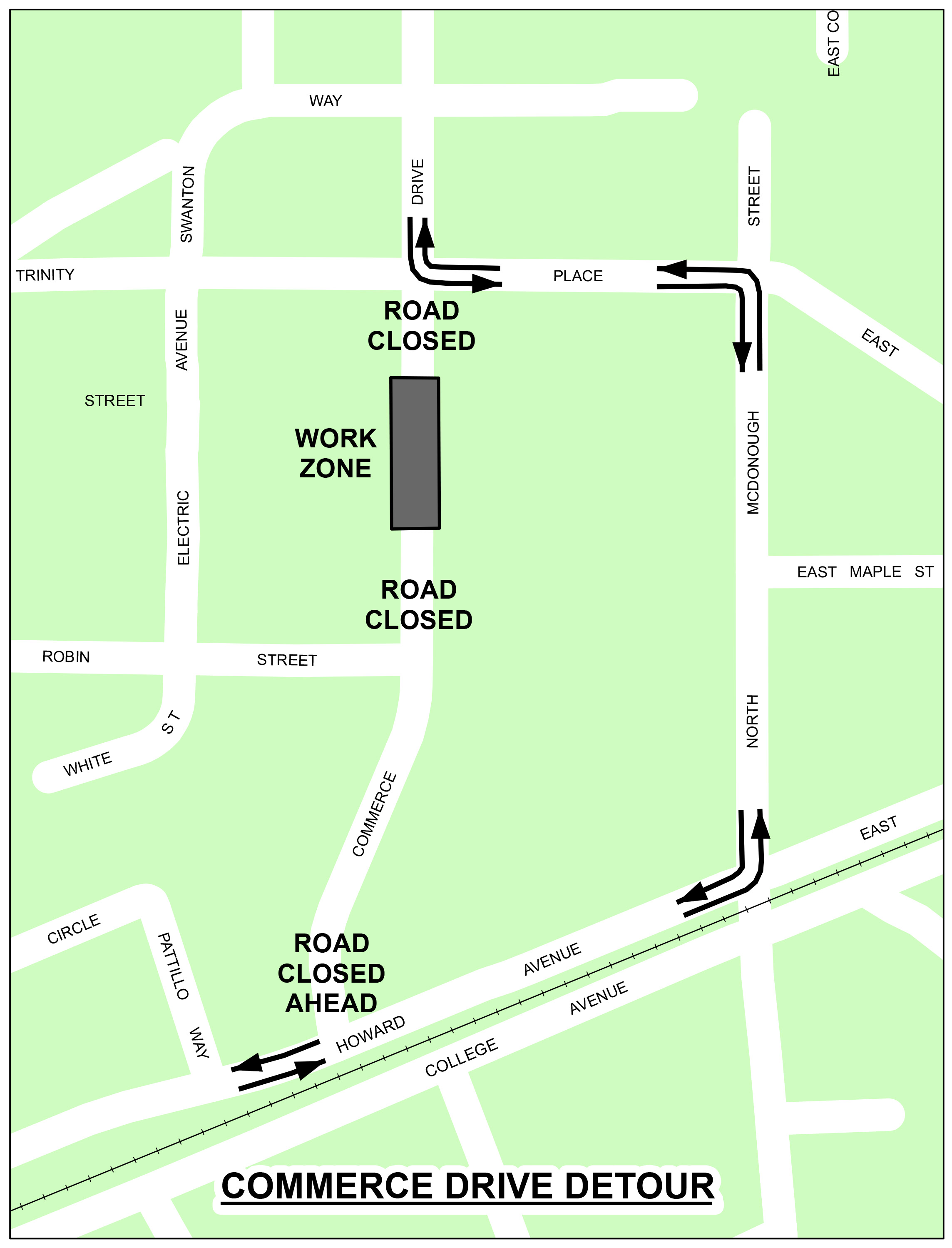 Weather permitting, the single lane closure currently installed on Commerce Drive between W. Trinity Place and Robin St. will expand to a full street closure beginning tomorrow, Tuesday, September 15. Work is expected to last 2 days (9/15 – 9/16), after which traffic will revert to the existing one lane closure. Inclement weather may affect this schedule.