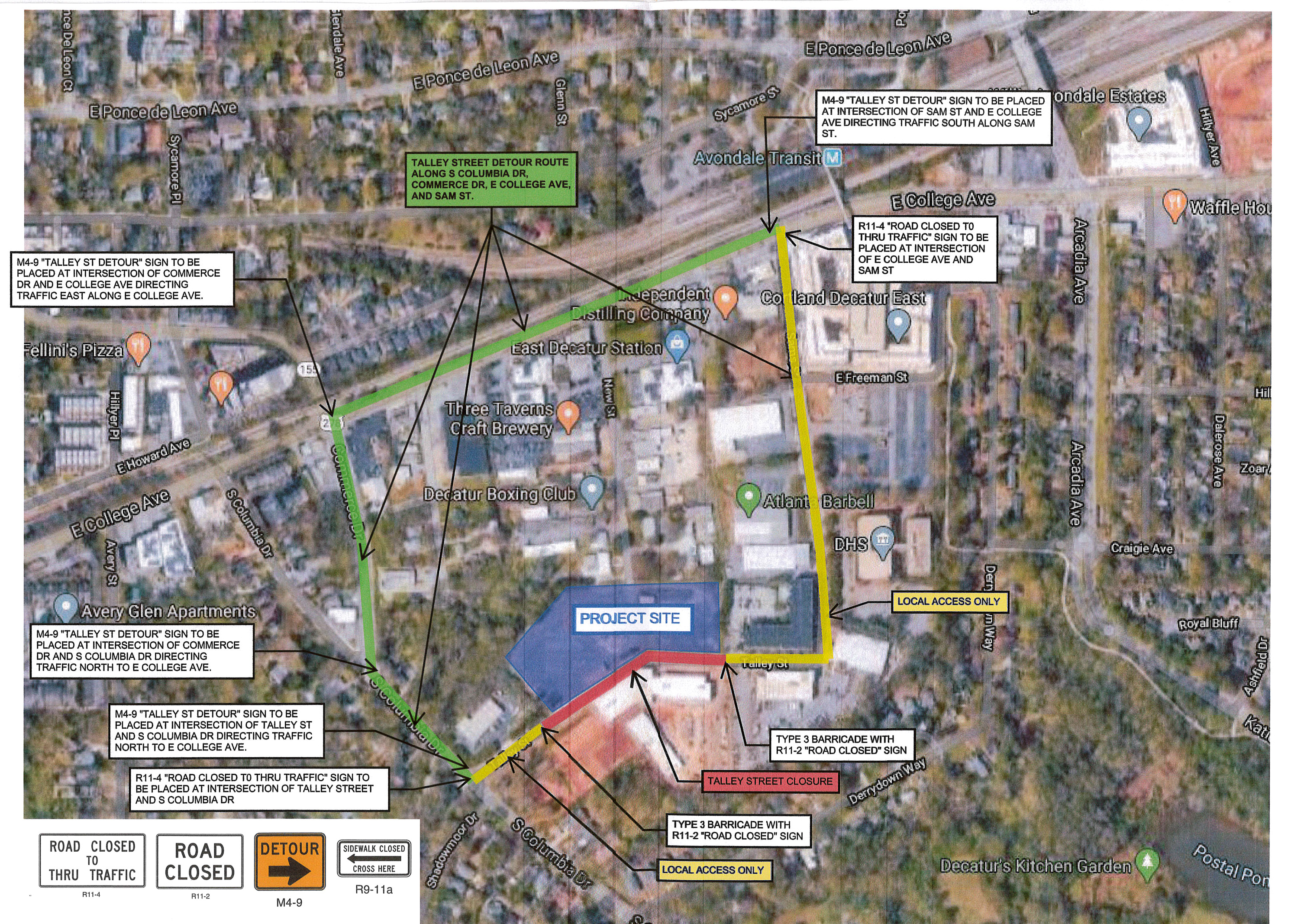 All driveways will remain accessible via Sams Street. Pedestrians will be routed to the south side of Talley Street during the closure. A map of the affected area is below (click for larger view).